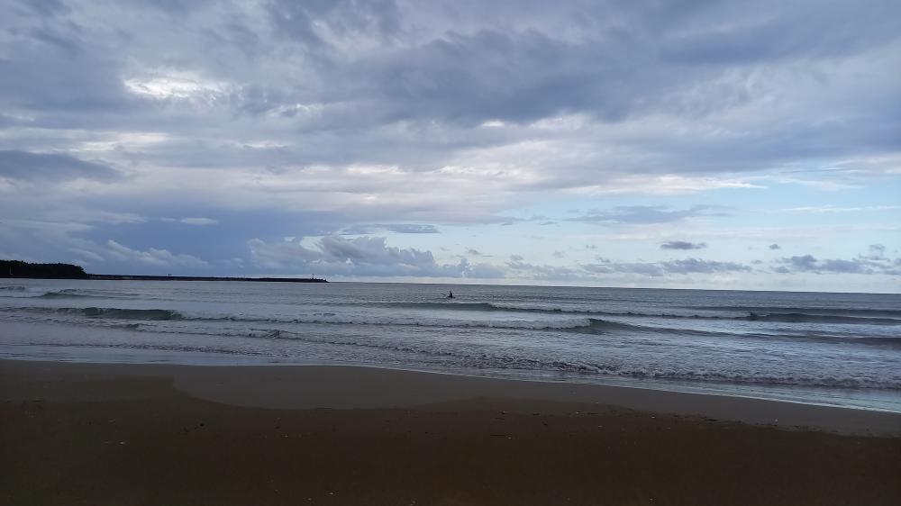 北東の風弱い。面OK。サイズすね〜ひざ。セット間隔長めインサイド寄りの力ないトップのみのダラダラ。たまに入る大きめの波選んでもロングでなんとか少し乗れる程度。人数 2 AM7:55