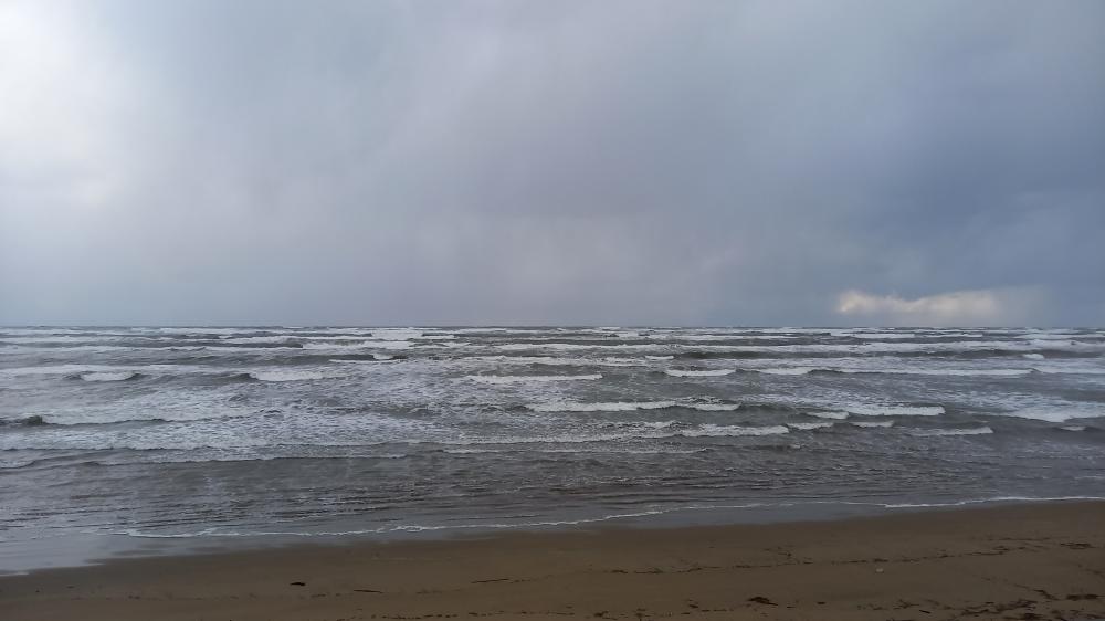 北北西の風極強。クローズ・アウト!遥かアウトから頭オーバー・サイズの波と風が吹き荒れる大シケ状態。 AM8:04