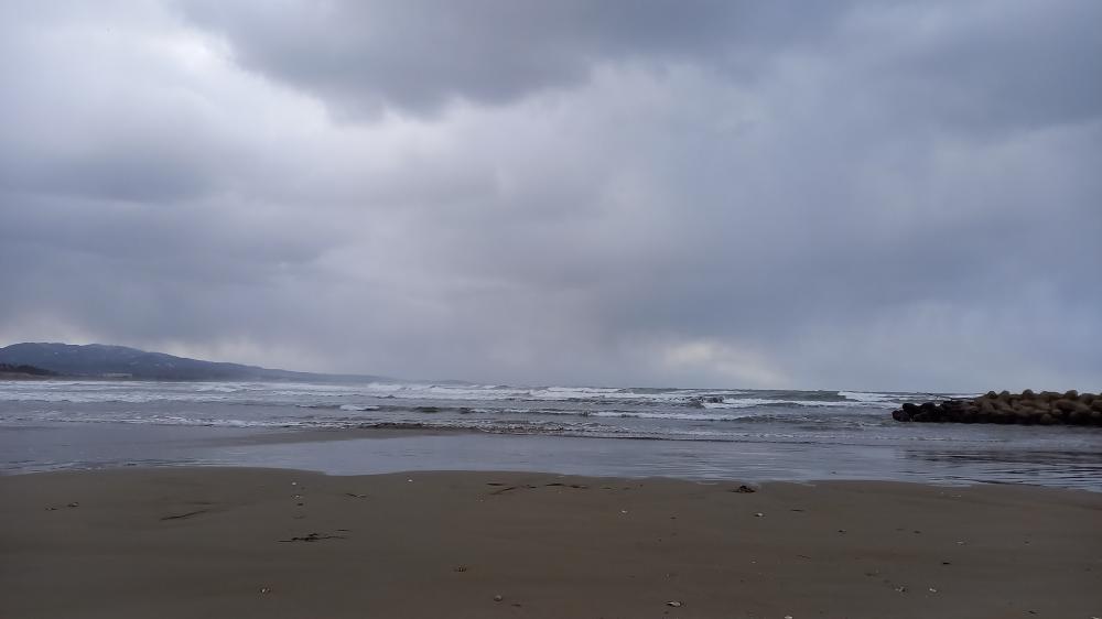 北西の風弱い。ほぼクローズ・アウト!アウトから頭サイズのグチャつく波が数多く打ち寄せるシケ状態。乗れそうな波はありません。 AM8:01