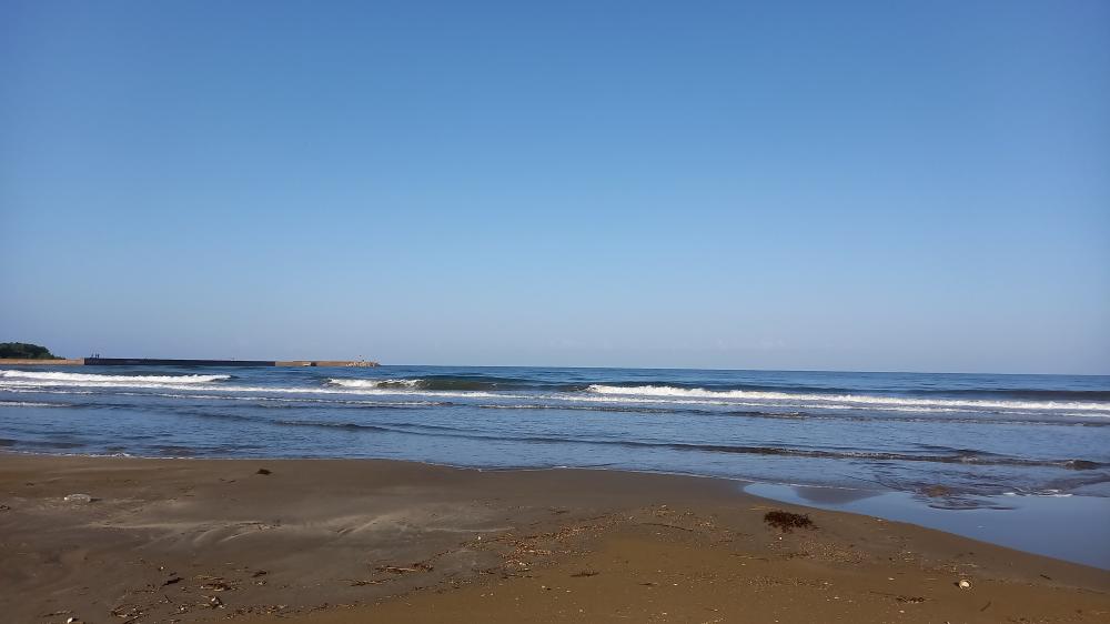 ほぼ無風。面OK。サイズひざセットもも。弱いウネリとインサイド寄りの厚くヨレヨレの速いブレイク。たまに入るセットの切れ目選べば繋いで少し走って1アクション程度可能。人数 4 AM7:51