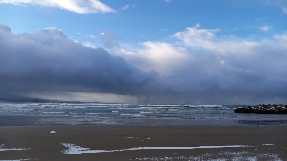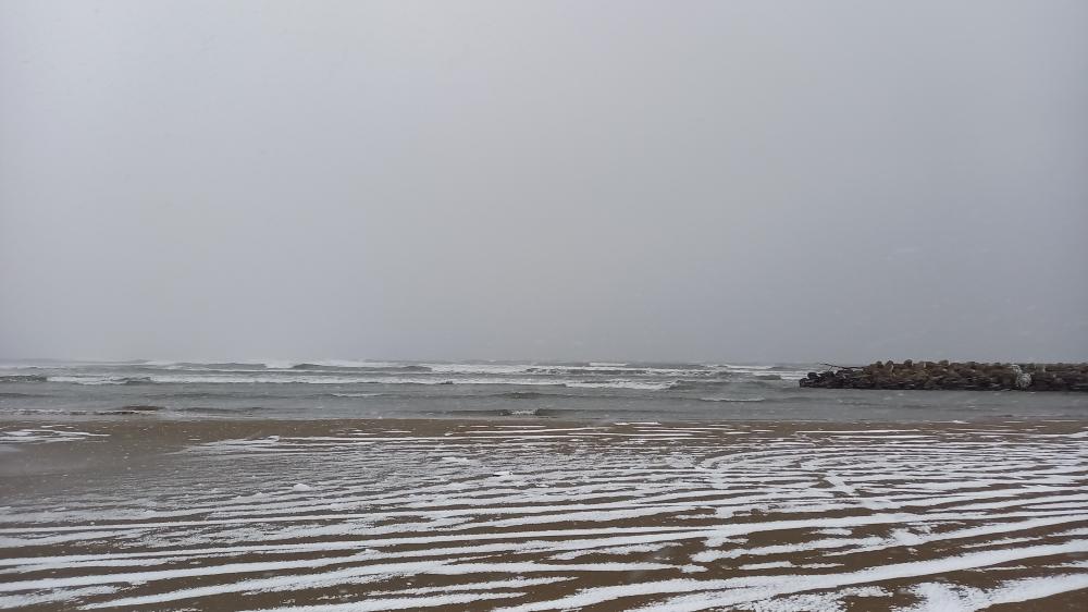 北西の風強い。クローズ・アウト!アウトから頭サイズの波と風が打ち寄せるシケ状態。セットが入るとハードでジャンクです。積雪はほぼありません。 AM8:07