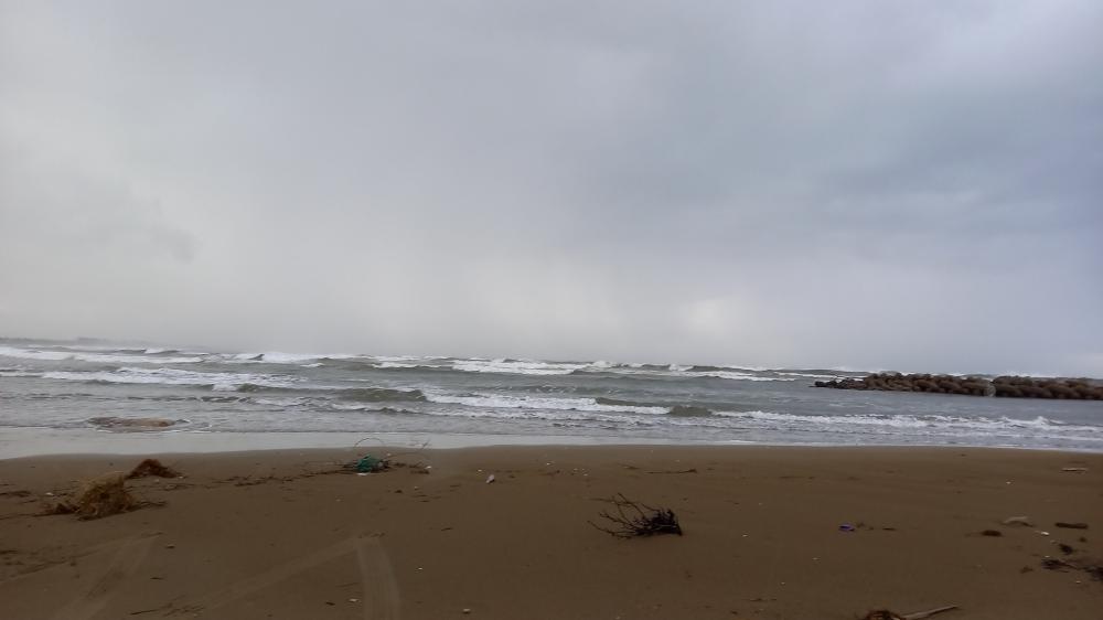 北西の風強い。クローズ・アウト!遥かアウトから頭オーバー・サイズの波と風が打ち寄せる大シケ状態。 AM7:56