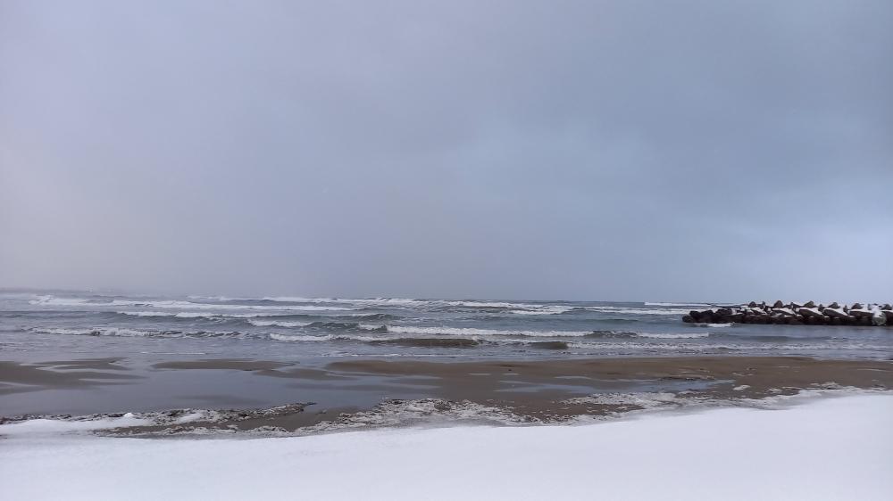 北西の風やや強い。ほぼクローズ!アウトから胸〜肩サイズのグチャつく波が数多く打ち寄せるシケ状態。乗りシロほぼなくクローズ・アウト!積雪今の所、5センチ程度。 AM8:01
