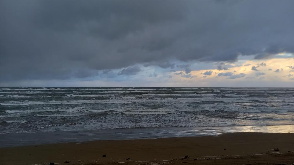 北西の風極強。クローズ・アウト!遥かアウトから頭オーバー・サイズの波と風が吹き荒れる大シケ状態。 AM7:58