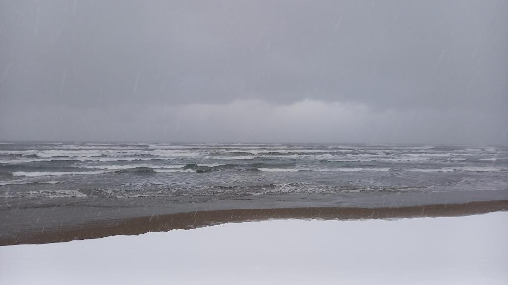 北西の風弱い。ほぼクローズ!アウトから頭サイズの波が数多く打ち寄せるシケ状態。乗れそうな波はありません。積雪20センチ程度で除雪なく海までのアクセス悪い。 AM8:08