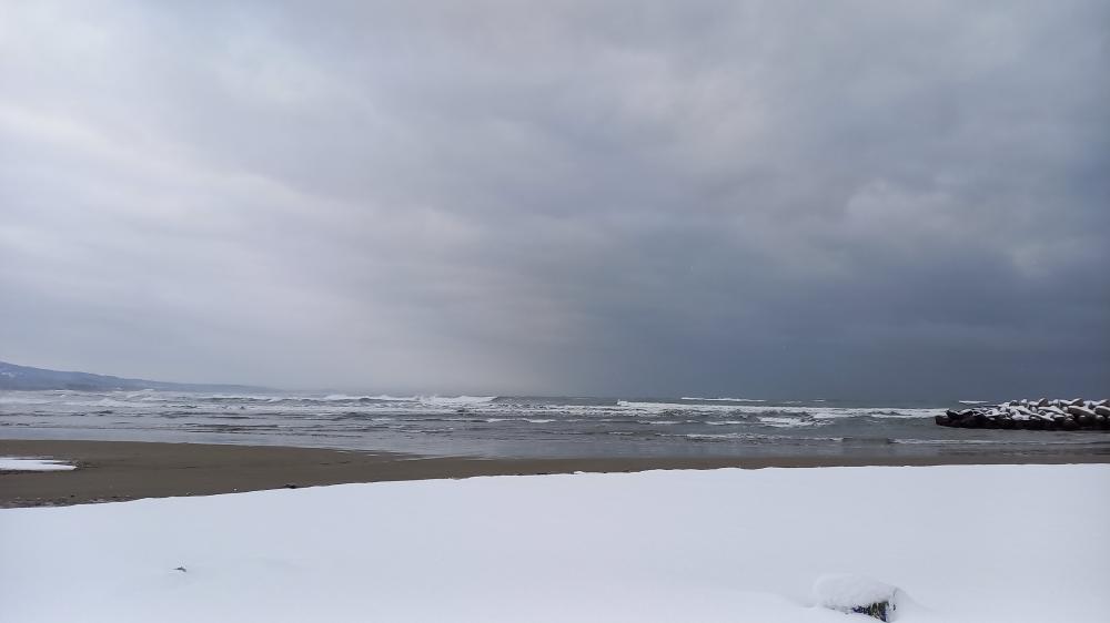 ほぼ無風。面OK。サイズ肩〜頭。アウトからやや波数多くグチャつくトロ・ワイドのブレイク。セットが入るとハードで波落ち着くまで待つのがベター。人数0 積雪あり海岸に侵入注意! AM8:16